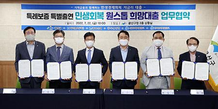 광산구는 22일 오전 구청 2층 상황실에서 광주신용보증재단, 광주은행, 서광주새마을금고, 한마음새마을금고, 우산신협과 ‘2022년 소상공인 특례보증 대출 업무협약(MOU)’을 체결했다.