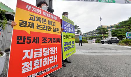 전교조전남지부도 이날 오전 전남도교육청 앞에서 기자회견을 열고 \"초등학교 입학 연령을 현행 만 6세에서 만 5세로 1년 앞당기는 학제 개편 방안은 역대급 급조된 밀실 교육정책이며, 학교 현장을 전혀 모르고 내놓은 탁상행정의 전형이다\"며 \"초등학교 조기 입학 정책을 철회해야 한다\"고 촉구했다.