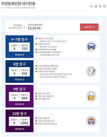 대기 현황은 북구청 홈페이지 분야별 정보 메뉴의 ‘차량교통’-‘차량등록민원 대기현황’ 카테고리에 접속해 복잡한 절차 없이 간편하게 확인할 수 있으며, 해당 서비스는 차량등록업무 전반에 적용된다.