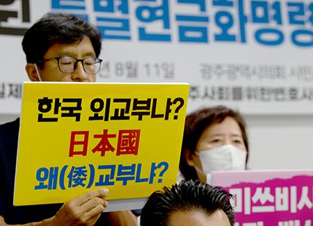 일제강제동원시민모임·민주사회를위한변호사모임 광주전남지부는 11일 오후 광주시의회 1층 시민소통실에서 기자회견을 갖고 일제 강제동원 피해자들에 대한 특별현금화명령 재항고심 사건에 대한 신속한 판결을 촉구하고 있다. 2022.08.11.