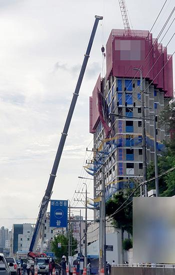 앞서 전날 오후 3시 35분께 광주 북구 운암동 한 대로변 신축 아파트 현장에서 14층에 설치하려던 거푸집 구조물(갱폼)이 크레인 쇠줄에 매달린 채 8층 외벽까지 걸쳐 앉았다.