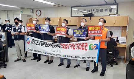 한국노총 공무원연맹 전남지역본부는 30일 전남도청 기자실에서 기자회견을 하고 내년 공무원 보수 인상안 재심의를 촉구했다. 2022.08.30