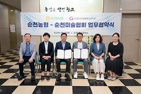 이번 협약은 순천농협 쇼핑몰인 \'NH장볼타임\'내에 지역 미술인들의 작품을 전시, 판매할 수 있는 문화코너를 개설함으로써 지역 예술인들의 작품을 온라인으로 홍보하고, 쇼핑몰 고객들에게는 온라인 미술관을 통한 고품격 문화예술 콘텐츠를 감상할 수 있는 기회를 제공하고자 지난 6일 순천농협 본점(조례동 소재)에서 업무협약을 체결했다.