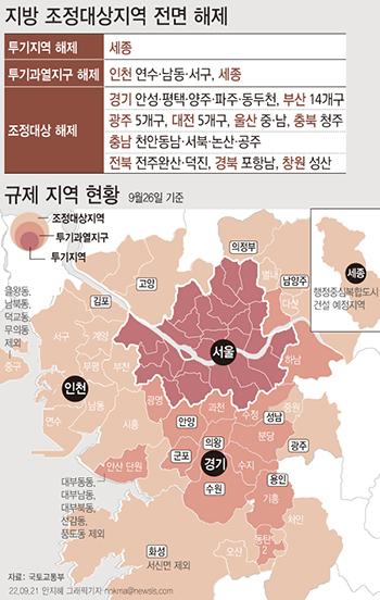 정부가 세종을 제외한 지방 광역시·도 모두 조정대상지역을 전면 해제하기로 했다. 수도권에서도 동두천·양주·파주·평택·안성 등 경기도 외곽 5개 지역에 대해 조정대상지역을 해제하기로 했다. 집값 하락세가 가파른 인천과 세종은 투기과열지구에서 해제하기로 했다.