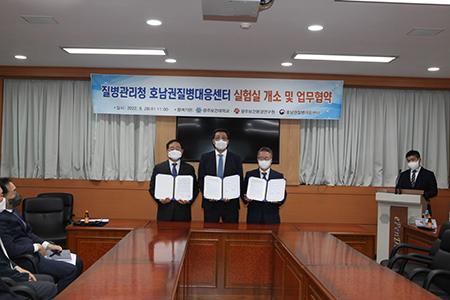 광주시 보건환경연구원은 질병관리청 호남권질병대응센터와 28일 호남권질병대응센터 진단분석과 실험실에서 감염병으로부터 안전한 사회를 조성하기 위해 효율적인 감염병 감시 및 상시 대응체계 구축을 위한 상호협약을 체결했다.