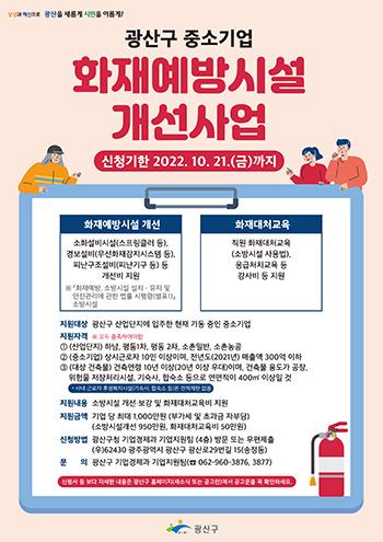 광주 광산구(구청장 박병규)가 21일까지 ‘중소기업 화재예방 시설개선 사업’에 참여할 기업을 모집한다.