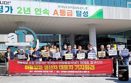 전국 마늘·양파 생산자 단체 6곳은 12일 오전 전남 나주시 빛가람동 한국농수산식품유통공사(aT) 본사 정문 앞에서 기자회견을 열어 \"당장 세계무역기구(WTO) TRQ 마늘 양파 수입공매를 중단해야 한다\"고 밝혔다.