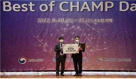 제13회 국가인적자원개발컨소시엄 Best of CHAMP Day 최우수 전담자(사진 우측 신현식 기술원) 시상식 (사진=한국광기술원 제공)