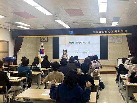 광양교육지원청 Wee센터는 지난 14일 전문상담교사 및 전문상담사 40여 명을 대상으로 \'그림책을 활용한 아동·청소년 상담’ 연수를 실시했다.