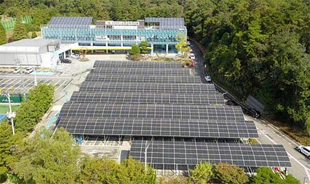 광주도시공사가 광주교통문화연수원 주차장에 377㎾규모의 태양광발전설비를 준공하며 탄소중립 에너지 자립도시 실현에 첫 발을 내디뎠다.
