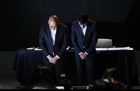 남궁훈(왼쪽)·홍은택 카카오 각자대표가 19일 경기도 성남시 카카오판교아지트에서 열린 \'데이터 센터 화재로 인한 장애 관련 대국민 기자회견\'에서 고개 숙여 사과하고 있다. 2022.10.19.