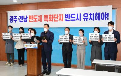 광주시의회 소속 의원들이 19일 시의회 브리핑룸에서 전체 의원 명의로 성명을 내고 \"민선8기 광주·전남 상생 1호 공약인 반도체 특화단지를 기회발전특구의 첫 번째 모델로 지정해 줄 것\"을 정부에 강력히 요청하고 있다. /광주시의회 제공