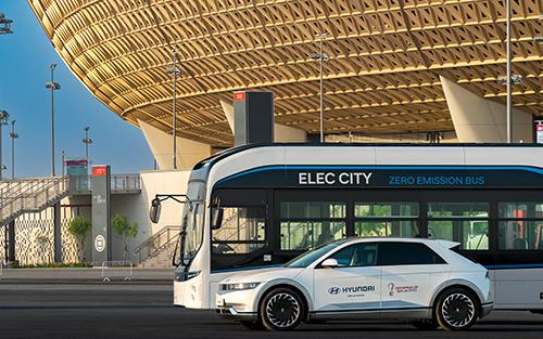 현대차는 2022 FIFA 월드컵™(FIFA World Cup 2022™, 이하 2022 월드컵)의 성공적 개최를 위해 승용·RV 446대, 상용 170대 등 616대의 운영 차량을 FIFA에 제공한다고 20일(목) 밝혔다. 이 중 236대는 탄소 중립 월드컵을 위해 친환경차로 구성됐다. 대회 공식 운영 차량으로 친환경차가 사용되는 것은 이번 월드컵이 처음이다. 2022 월드컵 운영 차량으로 제공되는 아이오닉 5와 일렉시티를 카타르 루사일(Lusail) 스타디움 앞에서 촬영한 모습. /현대차그룹 제공