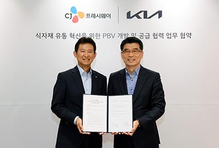 기아, CJ프레시웨이와 식자재 유통 혁신을 위한 PBV 개발 및 공급 협력 MOU 체결. (왼쪽부터) CJ프레시웨이 정성필 대표이사, 기아 송호성 사장. /기아 제공