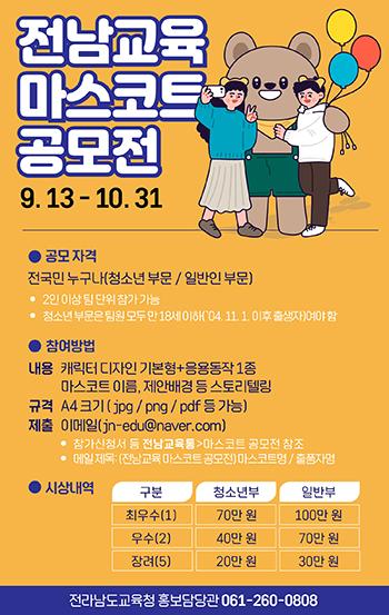 전남도교육청이 청소년, 학부모, 도민에게 더 친숙하게 다가가기 위해 오는 31일까지 ‘전남교육 마스코트 공모전’을 진행한다.