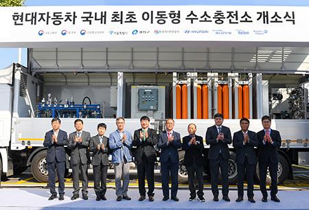 현대차가 국내 최초로 이동형 수소충전소 운영에 나선다. 현대차는 27일 서울시 광진구 중곡동에 위치한 이동형 수소충전소 운영지에서 \'이동형 수소충전소 H 광진 무빙 스테이션 (Moving Station)\' 개소식을 개최했다. /현대차그룹 제공