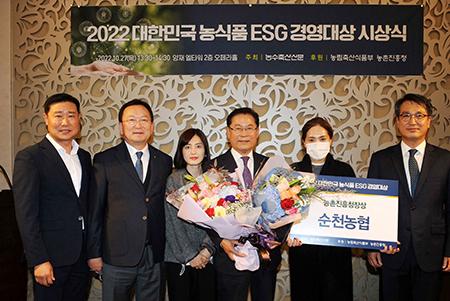 순천농협은 지난 27일 농수축산신문이 주최하고 농식품부, 농촌진흥청 후원으로 올해 처음 실시되는 ‘2022 대한민국 농식품 ESG 경영대상’에서 농촌진흥청장상을 수상했다.