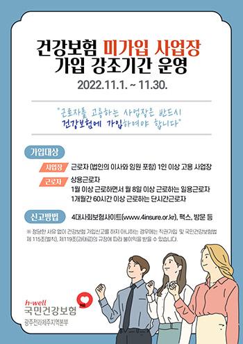 국민건강보험공단 광주전라제주지역본부(본부장 정일만)는 건강보험 미가입 사업장 소속 근로자의 권익보호를 위해 11월 한 달 동안 건강보험 미가입 사업장 가입 강조기간을 운영한다고 밝혔다.