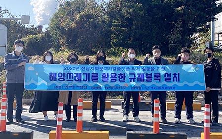 여수시도시관리공단(이사장 김유화)은 2022 전남지역문제해결플랫폼 의제실행을 위해 해양쓰레기로 만든 차선 규제블록을 1일 공단이 관리하는 시설물에 설치했다고 밝혔다.