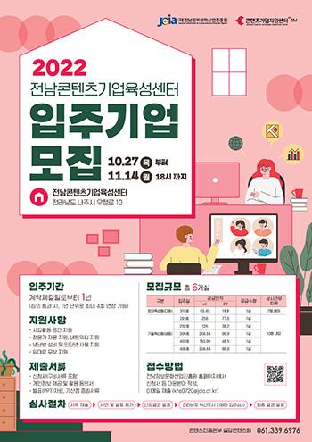 전남정보문화산업진흥원이 나주혁신도시에 설립·운영 중인 \'전남콘텐츠기업육성센터\'에서 콘텐츠 분야 신규 입주기업을 모집한다.
