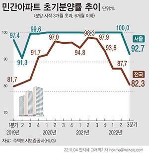 서울 아파트 초기분양율은 3분기 92.7%를 기록해 1년3개월 만에 100% 기록이 깨졌다. 수도권(서울·경기·인천) 역시 초기 분양율이 93.1%로 전분기(96.9%) 대비 3.8%포인트 하락했다.