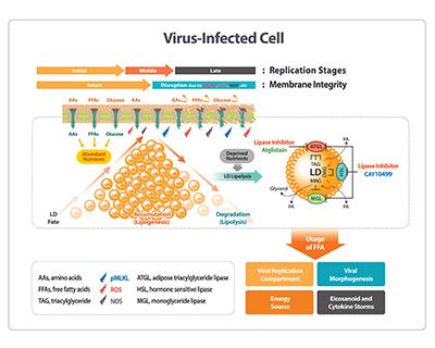 연구팀은 코로나19와 독감을 일으키는 다양한 RNA 바이러스는 지방방울(lipid droplet)을 세포 내에 축적한 뒤 생성된 유리지방산을 이용해 바이러스를 증식한다는 사실을 규명했다.