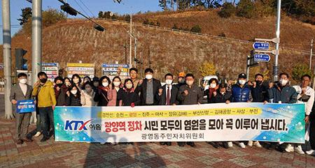 광양시 광영동은 지난 7일 금호대교 사거리에서 지역 내 8개 사회단체와 함께 KTX-이음 광양역 정차의 필요성을 알리고 모든 시민의 서명 운동 동참을 요구하는 캠페인을 벌였다.