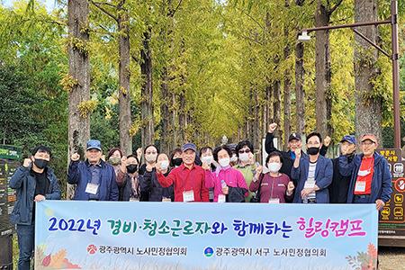 광주 서구노사민정협의회가 지난 10월 26일, 11월 7일 두 차례에 걸쳐 열악한 근무환경과 고용불안에 시달리고 있는 관내 아파트 경비·청소근로자 40여 명을 대상으로 힐링캠프를 진행했다.