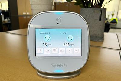 ‘실내공기 질 측정기’는 환경부 미세먼지 간이측정기 성능인증 1등급을 받은 제품으로, 초미세먼지(PM 2.5), 휘발성유기화합물(TVOC), 이산화탄소(CO2)뿐만 아니라 온도, 습도, 기압, 소음 등도 실시간으로 모니터링 할 수 있다.