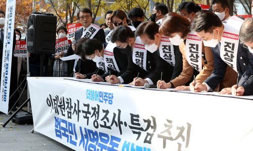 더불어민주당이 \'이태원 참사\' 국정조사 및 특별검사 실시를 위한 범국민 서명운동을 사흘째 이어가고 있다. 장외 여론전을 통해 국정조사 실시에 대한 명분을 쌓고, 여권이 동참하지 않게 되더라도 국정조사를 추진하도록 하는 동력을 구축하기 위한 것으로 풀이된다.