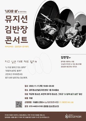 광주시는 수능일인 17일 청소년삶디자인센터(이하 삶디센터) 어서옵쑈에서 뮤지션 김반장 초청 진로콘서트를 펼친다고 14일 밝혔다.