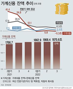 한국은행이 22일 발표한 \'2022년 3분기 가계신용(잠정)\'에 따르면 올 3분기 말 금융권 전체 가계대출과 카드사, 백화점 등 판매신용을 더한 가계신용 잔액은 전분기말 대비 2조2000억원(0.1%) 증가한 1870조6000억원으로 집계됐다. 증가폭은 전분기(5조5000억원) 보다 큰 폭 축소됐다. 가계신용은 지난 2013년 2분기 이후 38분기 연속 증가세를 이어오고 있다.