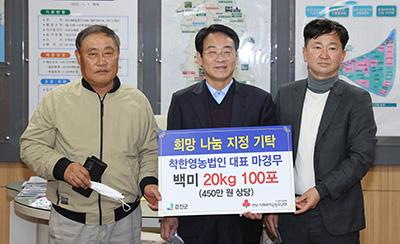 착한영농조합법인은 450만 원 상당의 백미 20kg 100포를 강진군 기탁해 어려운 이웃들에게 전달될 예정이다.
