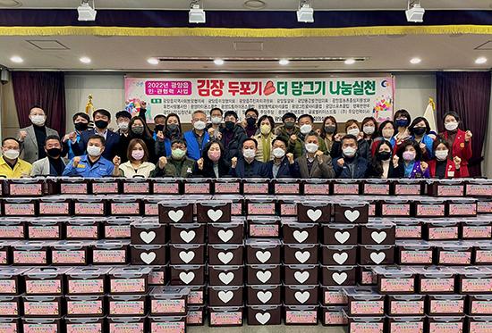 광양읍 지역사회보장협의체(공공위원장 김종호, 민간위원장 허형채)는 지난 11월 30일 소외계층 500가구에 김장김치를 전달하는 ‘김장 두 포기 더 담그기’ 나눔 실천행사를 진행했다.