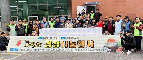 광양시 광영동발전협의회는 지난 3일 광영중앙교회 식당에서 5개 사회단체와 함께 동절기 취약계층에 지원할 사랑의 김장 나눔 행사를 가졌다.