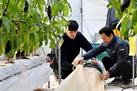 6일 오전 광주 광산구 삼도동에서 시설하우스를 운영하며 가지 농사를 짓고 있는 심효섭(34)씨가 아버지와 함께 전기온풍기를 설치하고 있다. 2022.12.06.