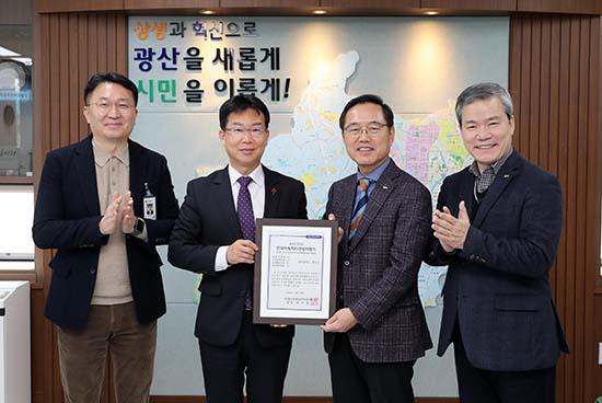 광산구는 14일 한국공공자치연구원으로부터 한국지방자치경쟁력지수 우수기관 인증서를 전달 받았다. 박병규 광산구청장(중앙 왼쪽), 이기헌 한국공공자치연구원장(중앙 오른쪽)이 함께 기념사진을 촬영하고 있다. /광산구 제공