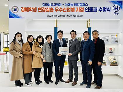 전남도교육청(교육감 김대중)이 22일 ㈜해농 해양캠퍼스에서 장애학생 현장실습 우수산업체 인증패를 수여했다.