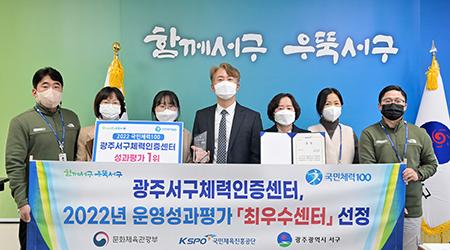 광주 서구(구청장 김이강)는 지난 23일 문화체육관광부 주최 및 국민체육진흥공단 주관 2022년 국민체력100 사업평가에서 최우수기관으로 선정됐다.