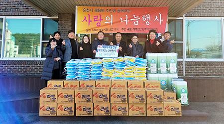 율촌·해룡산단협의회는 ‘사랑의 선물’ 전달행사에서 백미와 라면, 화장지 등 총 3백만 원 상당의 물품을 전달하며 이웃사랑을 실천하는 뜻깊은 시간을 보냈다.
