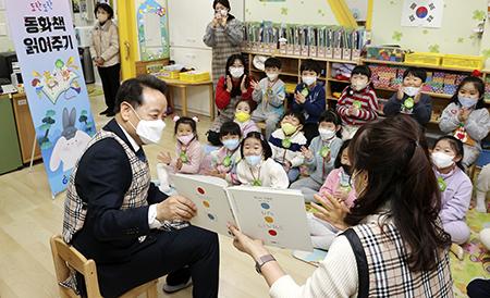 광주 동구(청장 임택)는 계묘년 새해를 맞아 전남대학교병원 어린이집을 방문해 아이들에게 동화책을 읽어주는 것으로 올해 첫 구정 행보에 나섰다고 밝혔다.