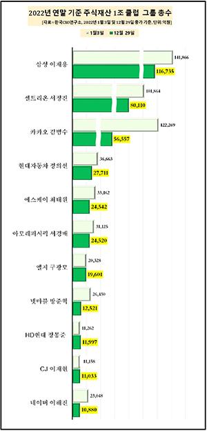 한편 이번 조사에서 그룹 총수 중 5명은 작년 연초 대비 연말 주식재산이 증가해 눈길을 끌었다.