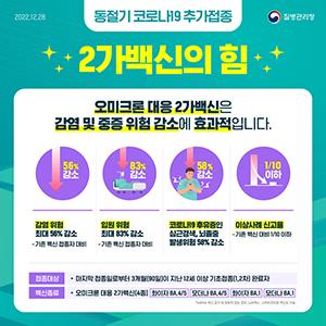 현재 중국발 해외 유입 확진자가 급격히 증가하는 방역상황과 국내에서 발표된 예방접종 효과 등을 고려할 때, 건강 취약계층의 동절기 2가백신 추가접종은 꼭 필요하다.