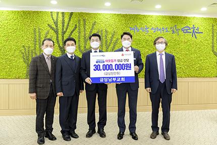 순천 금당남부교가 지난 10일 이웃돕기 성금으로 3000만 원을 기탁한데 이어 농협은행 순천시지부가 1000만 원 상당 농산물꾸러미 150상자를 순천시에 기탁했다.