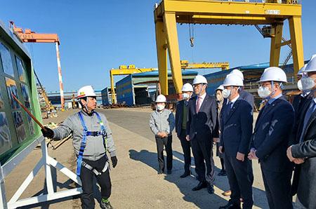 한창섭 행정안전부차관과 문금주 전남도 행정부지사를 비롯한 민간전문가들이 12일 영암군 대불산단 조선업체인 ㈜유일을 방문해 관계자로부터 제조업 인력난에 대한 의견 등 현황을 청취하고 있다. (사진=전남도 제공) 2023.01.12.