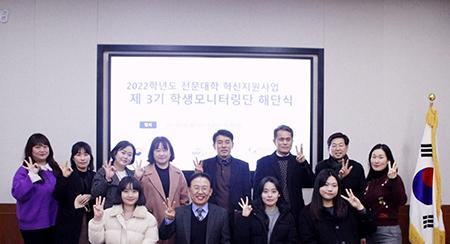 청암대학교는 지난 1월 30일 청암관 1층 회의실에서‘혁신지원사업 제 3기 학생모니터링단 해단식’을 가졌다. 제 3기 학생모니터링단은 2022년 9월 16일 발대식을 기점으로 혁신지원사업의 성과 공유·확산과 학생 중심의 성과 모니터링을 위해 약 5개월 간 활발하게 활동을 해왔다.