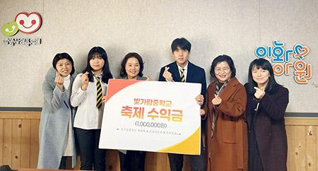 나주 빛가람중 학생자치회 학생들과 학부모회는 2월 3일 \'2022 빛가온 축제\' 의 연계 사업으로, 학교 인근 이화영아원에 축제 수익금과 기부금 총 일백만원을 전달했다.