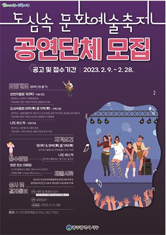 광주 서구(구청장 김이강)는 ‘설렘이 있는 행복 문화도시조성’을 위해 2월 9일부터 28일까지 ‘2023년 도심속 문화예술축제 공연단체’를 공개모집 한다.