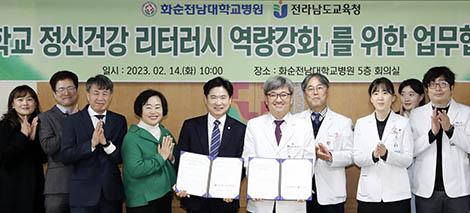전남도교육청과 화순전남대학교병원이 2월 14일(화) 화순전남대학교병원에서 김대중 교육감, 정용연 병원장을 비롯한 두 기관 관계자들이 참석한 가운데 학교 정신건강 리터러시 역량강화를 위한 업무협약을 체결했다.