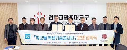 광주시교육청은 직업계고 고교생들의 재능기부 모임인 \'빛고을 학생기술봉사단\'이 다양한 분야에서 활동 할 수 있도록 하기 위해 \'가톨릭광주사회복지회\'와 업무협약을 체결했다고 15일 밝혔다.